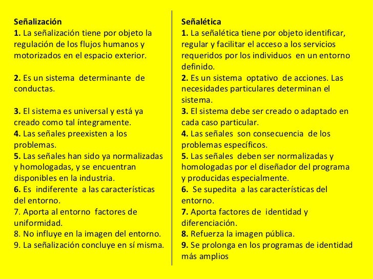 La señalización es la conjunción de diversas señales que tienen en común diversos rasgos tales como: color y/o códigos de color, síntesis de formas representativas, tipografías, etc.